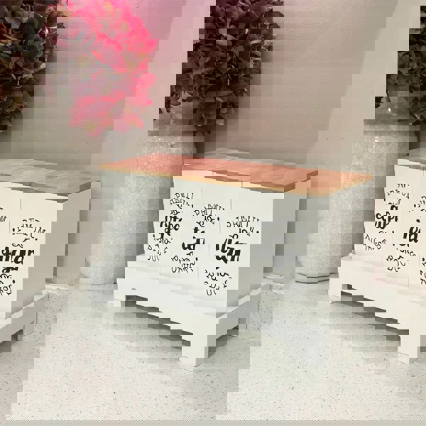 Made from a durable and sturdy wood with bamboo lids.