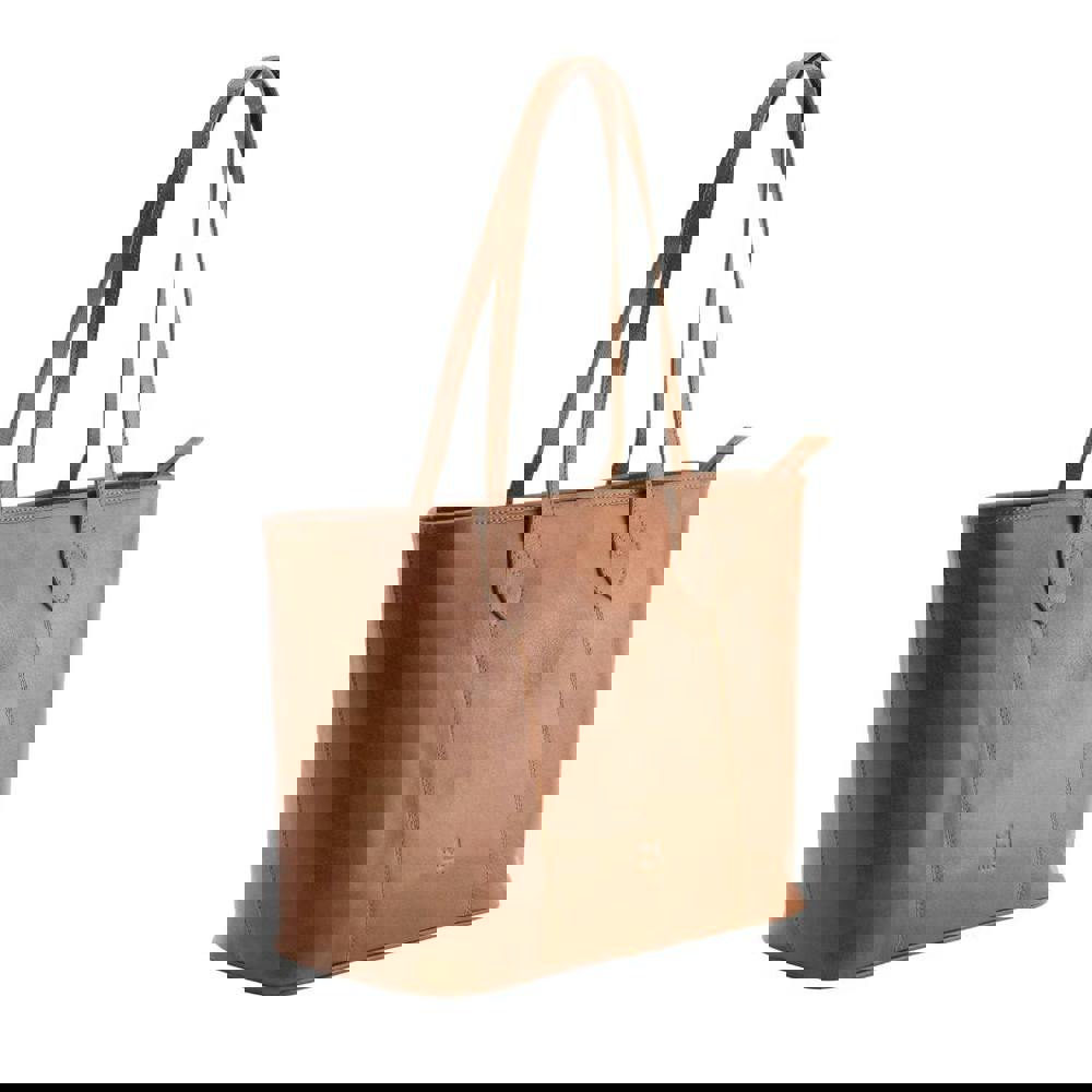 The generous main compartment is secured with a zip-top closure to keep belongings safe. Inside, the soft poly mix lining includes a zipped pocket for valuables and two slip pockets ideal for storing your phone, keys or other small essentials. The clean, classic shape and tan leather finish make this shoulder tote easy to pair with a range of outfits.