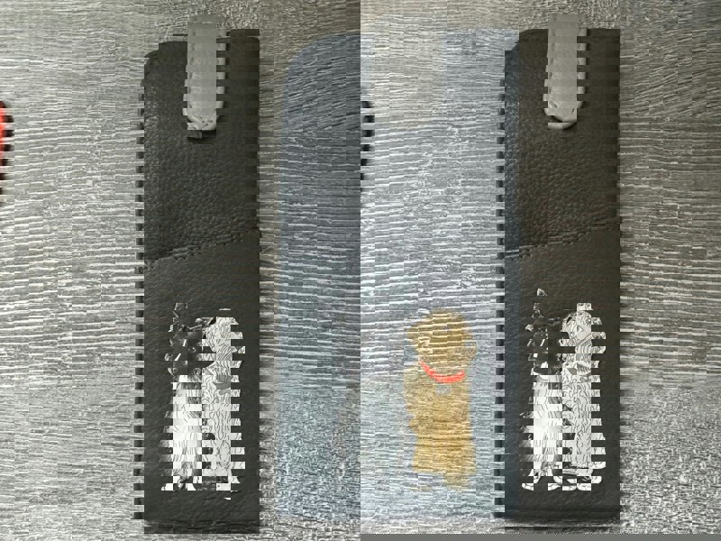 Add a playful touch to your everyday essentials with this charming glasses case from the Kennel Crew collection by Mala Leather. Expertly crafted in soft leather and fully lined to protect your eyewear, it features adorable appliquéd dogs on the front. Designed with both practicality and style in mind, it includes slip pockets on the front and back—perfect for storing cleaning cloths or small notes.