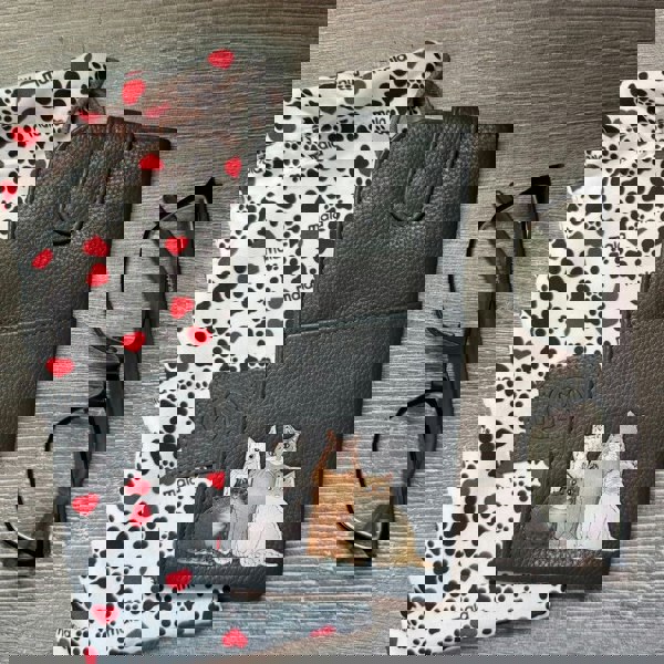 A stylish and practical glasses case from Mala Leather’s Meowfia collection. Crafted in soft dark grey genuine leather, the design is finished with charming appliqué cats in grey, cream, black, and Siamese, making it the perfect accessory for feline lovers. With a generous wide-fit size to accommodate most glasses and sunglasses, this case also includes useful slip pockets on the front and back for wipes, cards, or small accessories. A secure popper tab fastening keeps your eyewear protected, and it is beautifully presented in a patterned dust bag, making it an ideal gift.