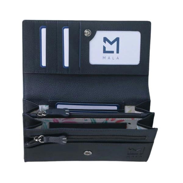 Inside, the purse provides excellent organisation with seven card slots, two ID windows, two open note compartments, two internal zipped pockets for coins and two slip pockets for receipts or small items. An external slip pocket at the back allows quick access to essentials. Built-in RFID protection helps safeguard your contactless cards from unauthorised scanning.