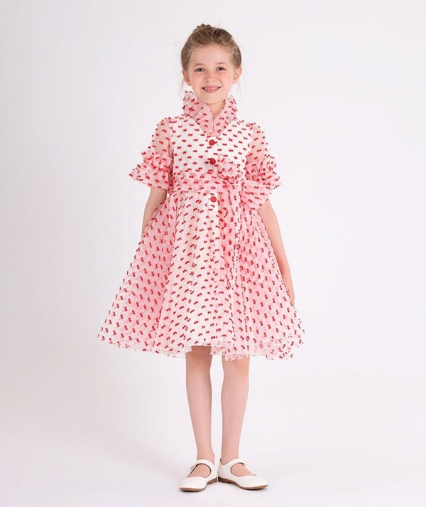 This girls flared dot dress from Mama Luma takes inspiration from a bygone era. It is made with an organza base and finished with exaggerated frills and a bobbled red bow pattern. A tie-up waist and elasticated cuffs complete the silhouette, while front button fastening keeps the look clean and structured.
