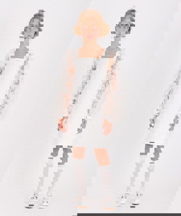 Mama Luma girls organza dress in white with a handmade construction and an ecru tone. A square neckline creates a clean, structured look, while the sleeves stand out with mesh panels and intricate floral stitching. Bow details complete the design, adding a decorative finish.