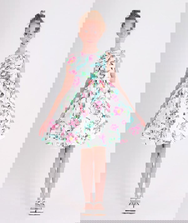 This girls dress from Mama Luma pairs a floral print with a pleated pattern effect for a structured look. An enlarged folded frill on one shoulder adds a bold detail, while the peplum hem brings shape to the silhouette. Finished with a crew neck and a zip fastening, it offers a clean, defined outline in white.