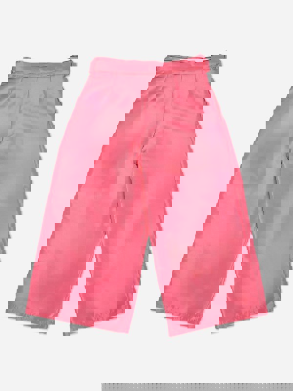 Mama Luma girls wide leg trousers in pink. The design uses ethically sourced fabric and handmade construction, with fine detailing throughout. A tie-up bow sits at the waist, paired with side pockets for a practical finish. The trousers fasten with a zip.