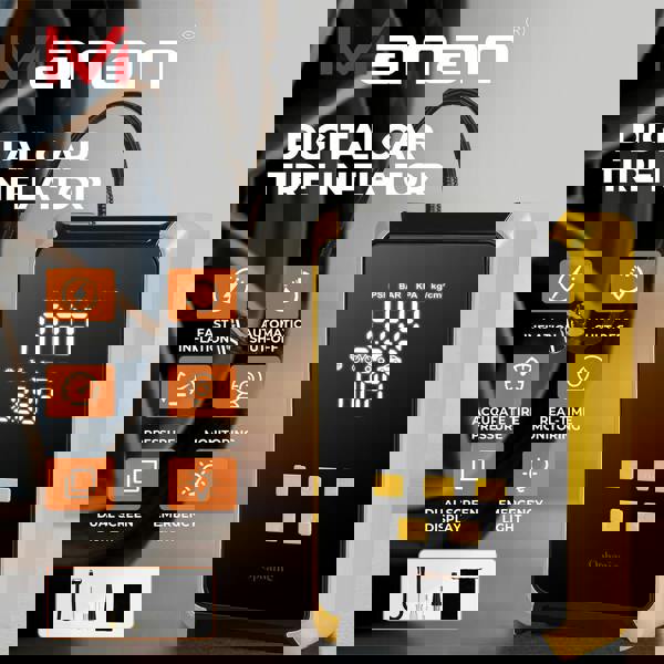 Featuring a dual digital display this smart tyre pressure monitoring system allows precise control with auto shut-off when your target pressure is reached. Use preset modes for cars bikes balls and more — or set custom values easily.