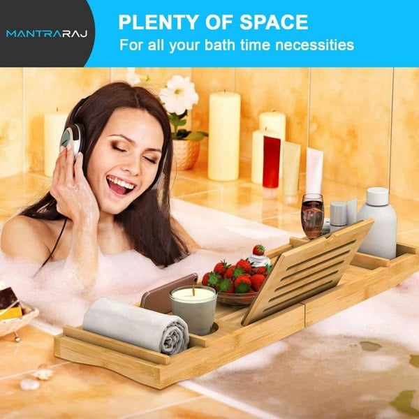 TRANSFORM YOUR BATHTIME ROUTINE DELUX BATH SPA EXPERIENCE : Elevate your relaxation with this elegant bamboo bath tray. Our bath rack is a perfect bathroom accessory designed to fit perfectly across your bathtub. A versatile wooden bath caddy tray that brings spa-like luxury to your home.