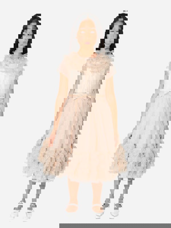 Marchesa Girls Trimmed Plumetis Tulle Gown in cream, handcrafted in Italy. The gown uses tulle with a trimmed plumetis finish, creating an intricate look suited to special occasions. Italian craftsmanship and a high-end design define the overall presentation, with the plumetis tulle detailing forming the main visual focus.
