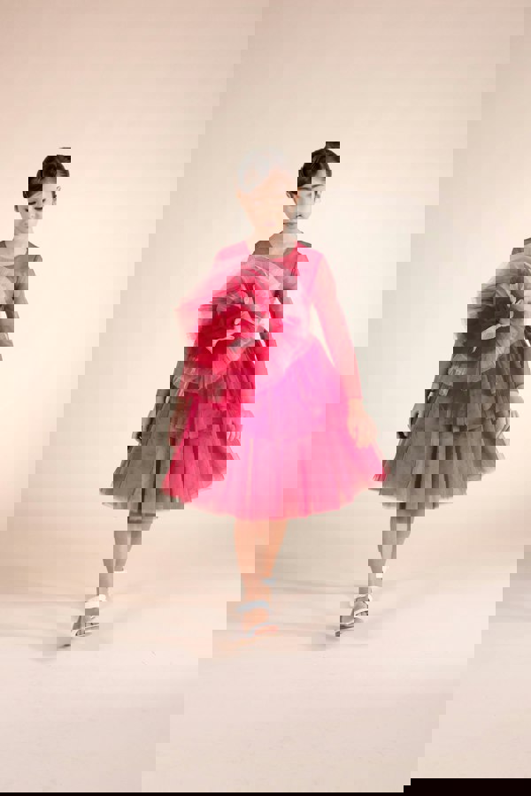Volant detailing adds definition to the silhouette, while the pink tone completes the finish. The design combines a structured waist with a full skirt for a standout occasionwear shape.