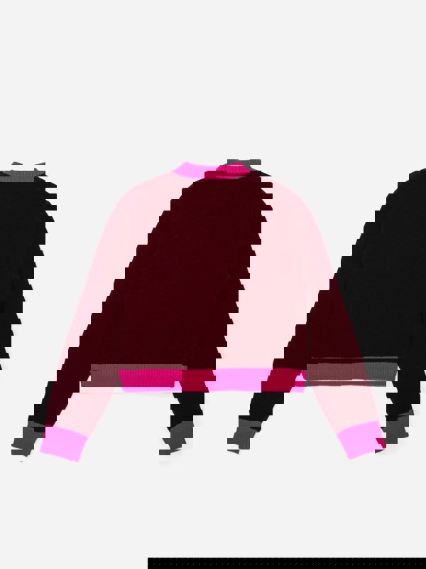This Marni girls jumper comes in a berry jam burgundy tone with pink edging and a pink “Marni” logo across the front. A cropped shape and long sleeves create a clean, modern silhouette, finished with wide ribbed edges for a defined outline.