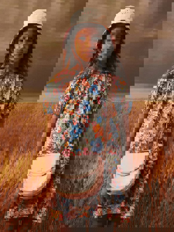 This Marni girls short sleeve dress is made from cotton poplin with an all-over Holiday print in multicolour. A ruffled curl trims the top of the garment, adding detail to the clean, everyday shape. The neckline is round, with elastic at the armholes and a button closure for fastening.