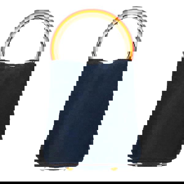 Bold, artistic and unmistakably Marni, the Pannier bucket bag is a striking statement piece that blends contemporary design with Italian craftsmanship. Crafted from rich navy suede, this compact yet distinctive bag is elevated by its sculptural arch top handle, finished in polished gold-tone metal with ivory, yellow and orange acrylic accents for a vibrant, modern contrast.