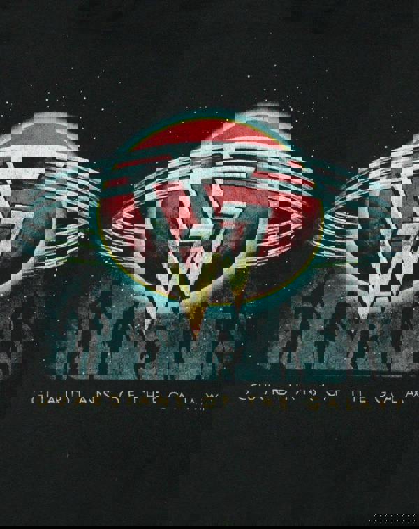 The print sees the Guardians of the Galaxy GG logo in a cool metallic look wrapped around a glowing red planet