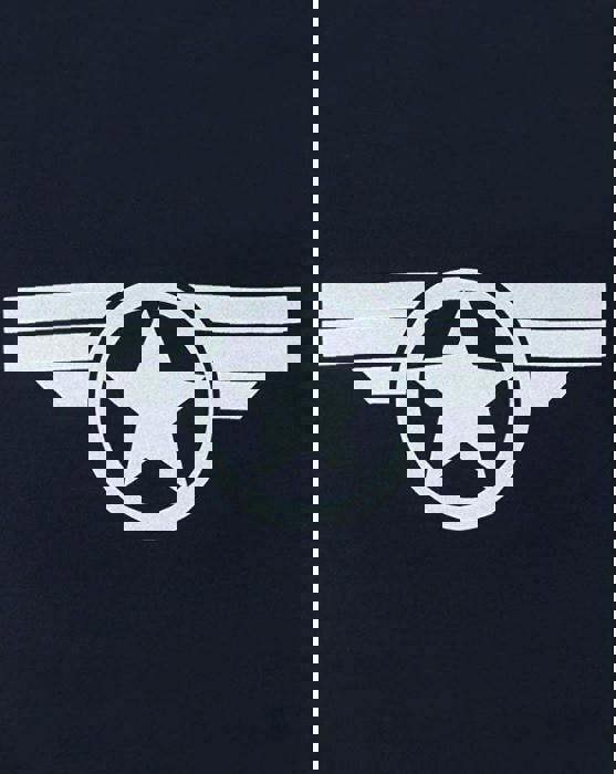 The bold print showcases the iconic star in the center of a circle, with three bold lines set against the navy blue of the t-shirt
