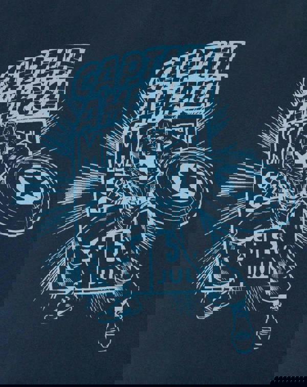 The print across the front of the t-shirt showcases a comic style image of the iconic Captain America in light blue