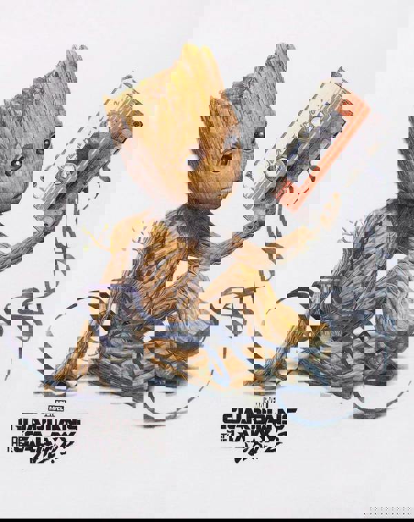 Groot is seen holding the "Awesome Mix Vol 2" tape and underlined by the Guardians of The Galaxy Vol 2 logo in solid black