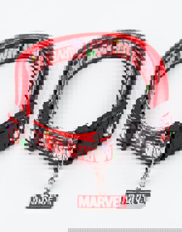 It includes a drinker or feeder bowl, a durable and adjustable lead, and a collar that has a stylish Marvel logo charm accessory.