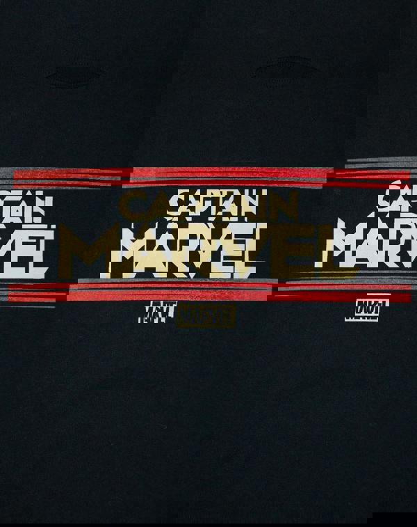 The print across the front has 'Captain Marvel' bold in gold with the classic red lines above and below