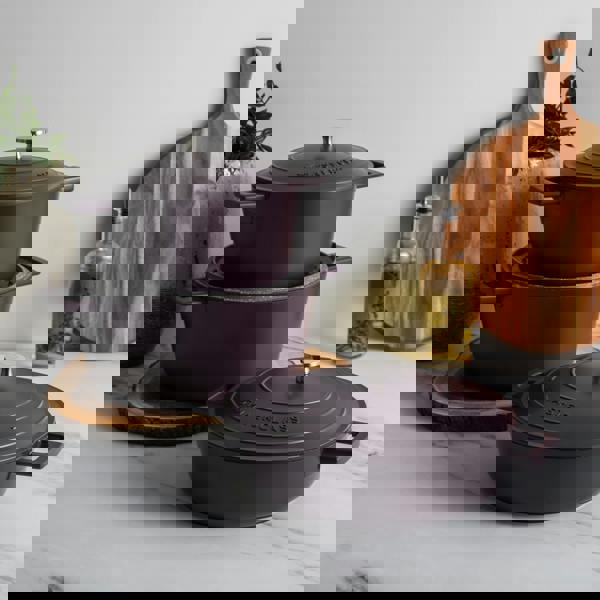 Upgrade your kitchen with the MasterClass 3pc Cast Aluminium Casserole Dish Set in eye-catching Purple, combining style, durability, and eco-conscious design. This versatile set includes three round casserole dishes: a compact 2. 5L, a 4L shallow casserole dish, and a generous 5L, ideal for everything from everyday meals to family feasts.