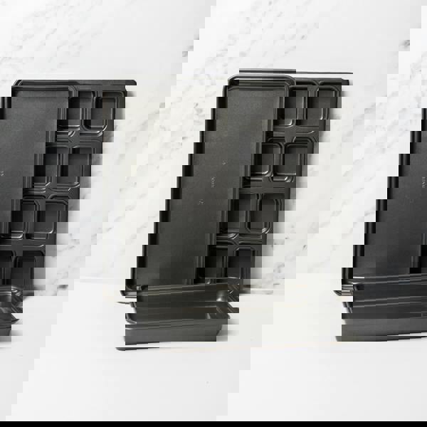 Included in the set is a 27cm x 20cm x 3cm pan, and a larger 34 x 20 cm x 4cm pan. Both pans bake brownies in one piece, for you to cut the brownies after baking. You’re not limited to brownies; these pans are also suitable for general grilling or roasting.