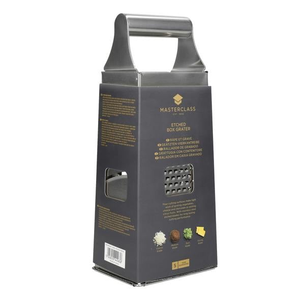 Grate your ingredients quickly and effectively with the MasterClass Acid-Etched Stainless Steel Box Grater. With its super-sharp, acid-etched blades and four grating surfaces, it makes light work of all kinds of grating.