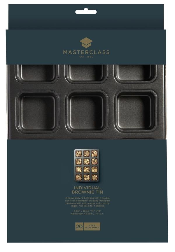 Bake gooey brownies with lovely crisp edges on all sides with the MasterClass 12-Hole Non-Stick Brownie Tin With Dividers. This commercial-grade carbon steel pan is built to last for years, and features a smart non-stick coating, so, you can remove your freshly baked brownies, and also flapjacks, with ease.