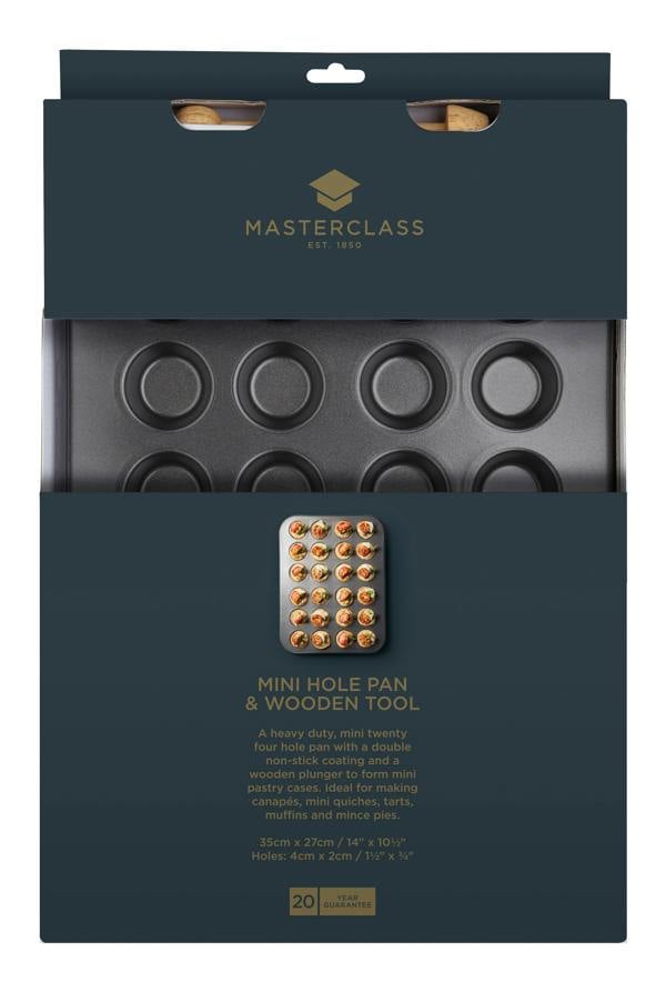 Leave a lasting impression with the MasterClass 24-Hole Non-Stick Mini Tart / Canapé Tray with Pastry Tamper. Its handy little wooden pastry press allows you to form perfect little pastry cases, while the heavy-duty 1 mm-thick carbon steel tray ensures you can enjoy years of excellent bakes.