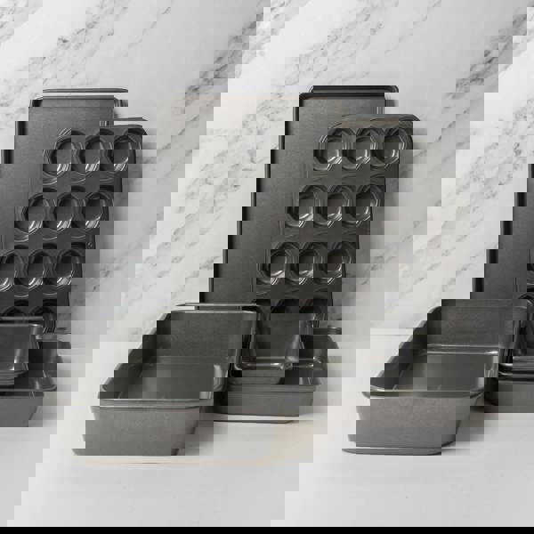 This MasterClass bakeware set brings together a Roasting Pan, Baking Tray, 12-Hole Non-Stick Cupcake Tray / Baking Pan, Square Baking Pan and a Non-Stick 2 lb Loaf Tin for everyday cooking and home baking. Designed for versatile use, it supports everything from family meals to sweet treats, helping you move confidently between roasting, traybakes and classic bakes.