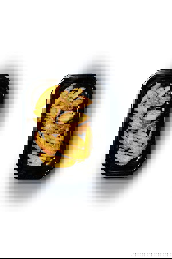 The oven tin measures 27 x 21 cm (10½” x 8½”), with a depth of 4 cm (1½”). This small-but-practical size makes it ideal for roasting smaller beef sirloins and pork shoulders to tender perfection, as well as cooking crisp roast potatoes and succulent veg.