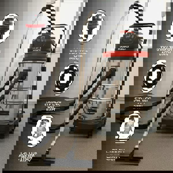 The stainless steel collection tank is supported by 4 castor wheels and an ergonomic handle for easier manoeuvring. A cloth filter is included, along with a set of attachments for switching between floor areas and tighter spots. The vacuum can be used with or without a bag, offering flexibility for different cleaning tasks. Completing the set, the black 5m hose is made from EVA & PE and measures 1mm thick.