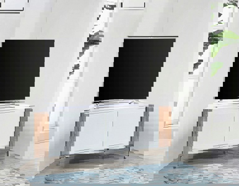 Finished in high gloss piano white with contrasting chrome legs, the stylish design of the Corvus entertainment unit will look perfect in any living room environment complimenting modern screens perfectly.