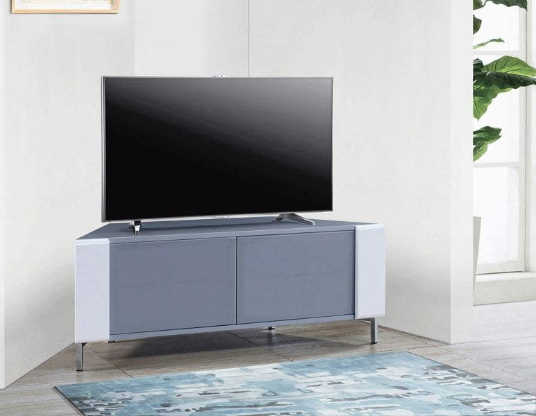 MDA Designs CORVUS Corner-Friendly Grey BeamThru Glass Doors with White Profiles Contemporary Cabinet for Flat Screen TVs up to 50"