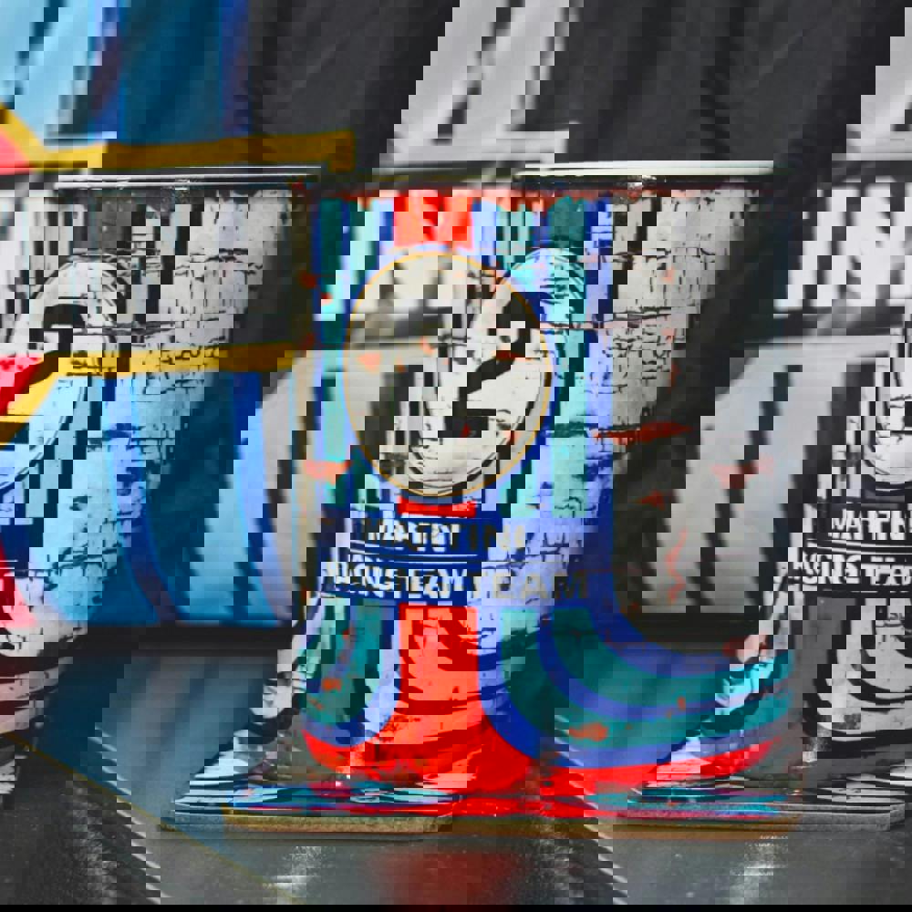Inspired by the blue and white striped oil splattered livery of the Martini Racing cars our mug is an eye catching addition to the daily brew.
