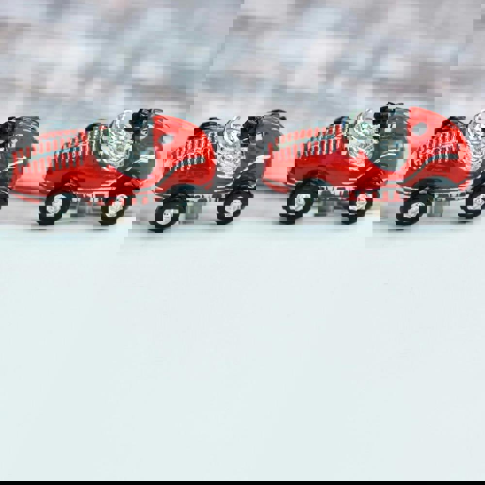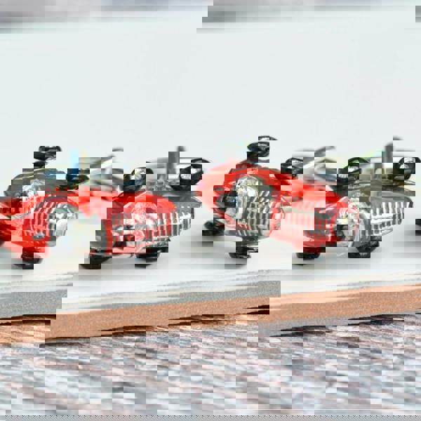 Each metal racing car is meticulously hand-painted, in a bright red that evokes the spirit of the racetrack. The cars are adorned with an abundance of louvres, grills, and exhaust pipes, adding depth and texture to the design. These features not only enhance the overall appearance of the cufflinks but also serve to create an authentic and realistic representation of the classic racing car.