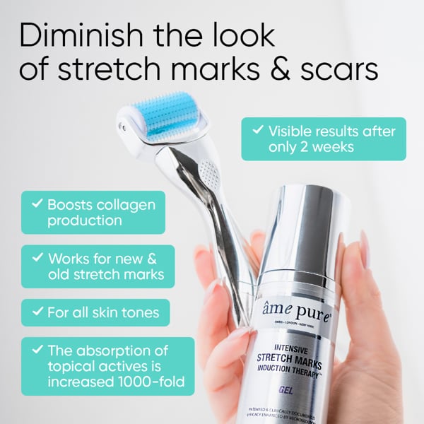 The fast-absorbing, skin-repairing âme pure® Intensive Stretch Marks Induction Therapy™ Gel should be applied immediately after rolling to soothe redness, accelerate healing, and boost overall results.