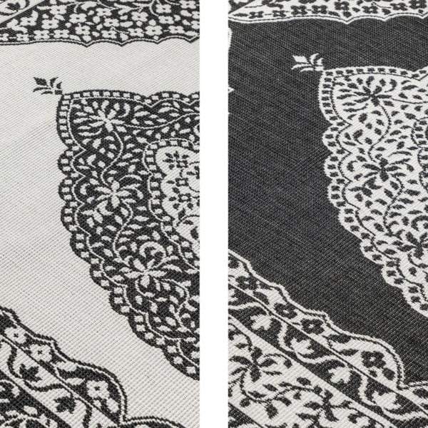 Bring versatile style and practical functionality to your home or outdoor areas with the Meekly Reversible Black Rug. Its subtle medallion-inspired pattern in muted black tones enhances living rooms, hallways, patios, or balconies with effortless charm.