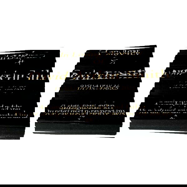 Crafted from premium high-grade polished black granite, this stunning memorial tablet is available in two substantial sizes – ideal for permanent outdoor placement in cemeteries, memorial gardens, or private estates. The deeply engraved, gold-filled personalised inscription is included at no extra cost, allowing you to create a heartfelt tribute that lasts for generations.