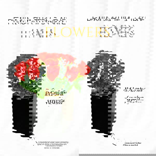Add a timeless touch of beauty and remembrance with this 25cm display of Premium Artificial Red Rosebuds with Gypsophila, featuring sixteen vibrant red rosebuds accented with delicate white gypsophila. This arrangement offers a heartfelt and lasting tribute, thoughtfully designed for granite memorial vases. It brings elegance and colour to any resting place, with no watering or maintenance required.
