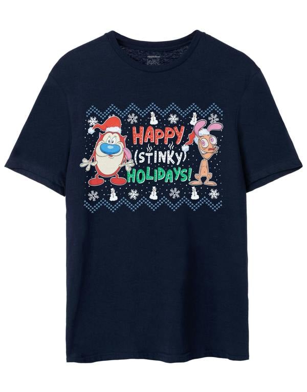 Ren & Stimpy Mens Blue Happy Stinky Holidays Short Sleeved T-Shirt