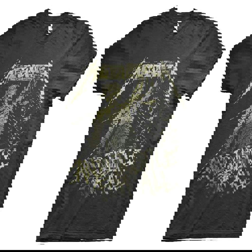 An official licensed Metallica Unisex Tee featuring the 'Justice Vintage' design motif. This high quality t-shirt design is available in the black colourway. Classic unisex fit soft-style cotton tee with crew neck and short sleeves. Available in a wide range of sizes from small through xx-large. Subject to availability.