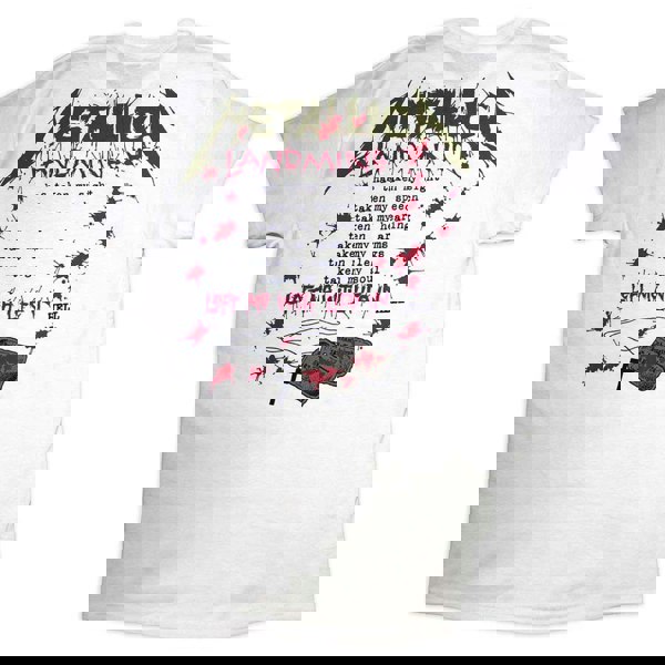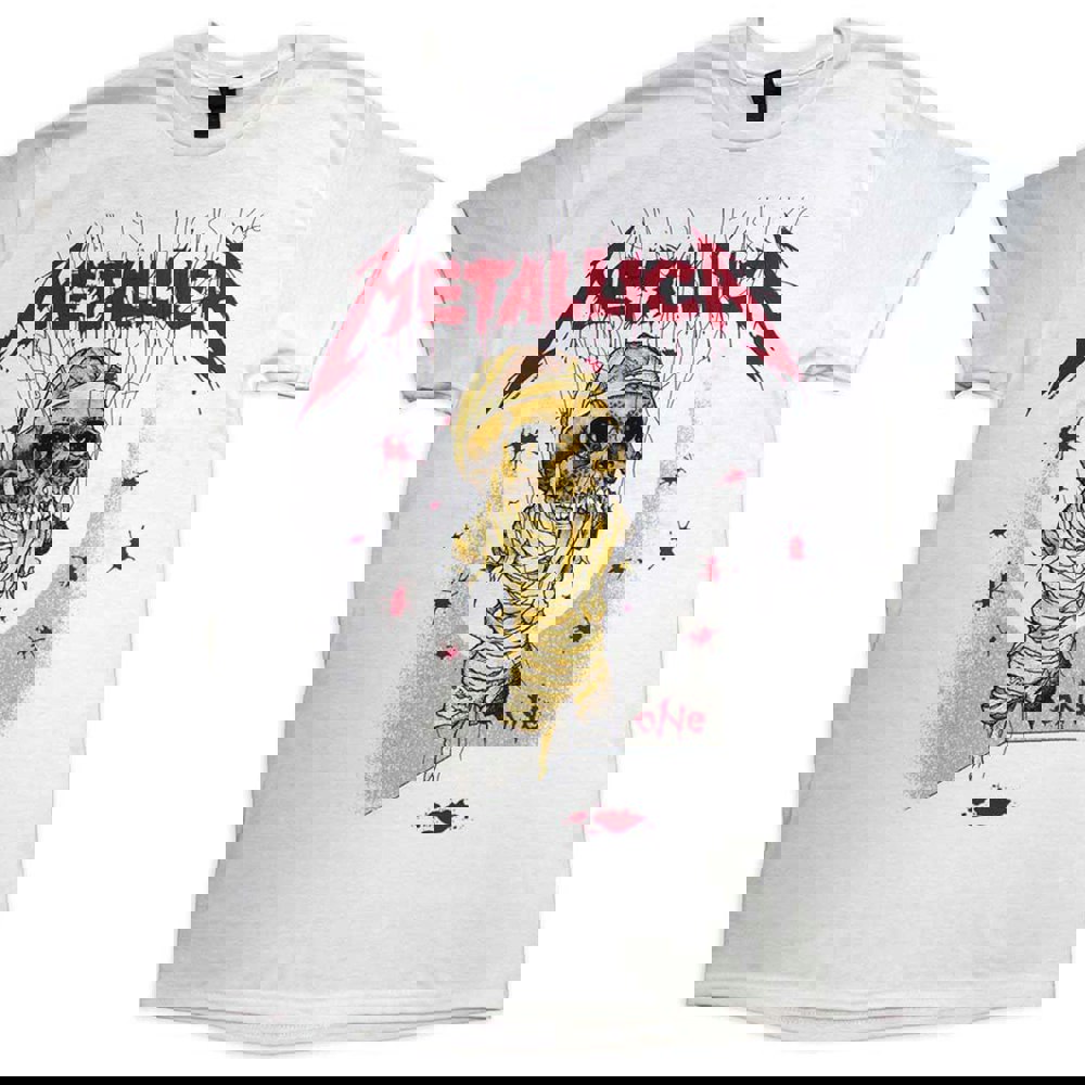 Classic fit soft-style cotton tee with a crew neck and short sleeves. Featuring the Metallica 'One Landmine' front & back printing. This high-quality t-shirt is available in a white colourway. Size options include Small through XX-Large.