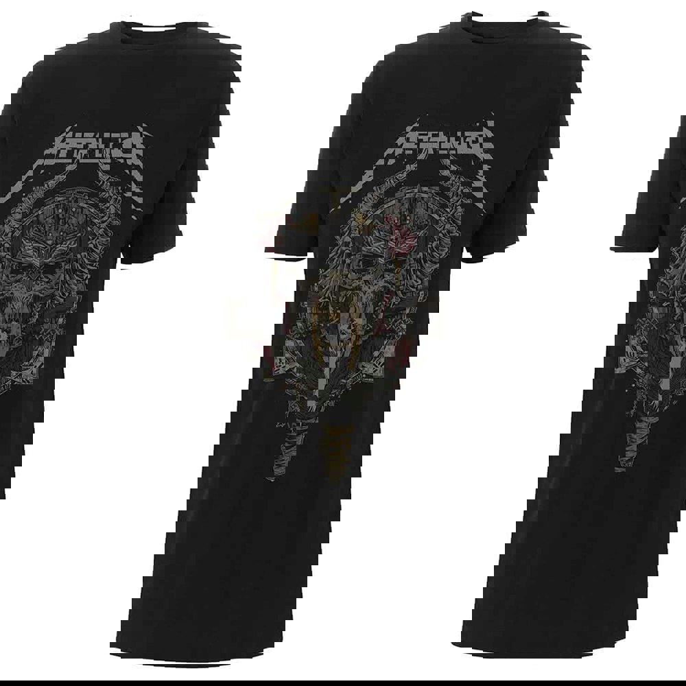 An official licensed soft-style cotton Tee featuring the Metallica 'Viking' graphic design. This high-quality t-shirt is available in a black colourway. Size options include Small through XX-Large.