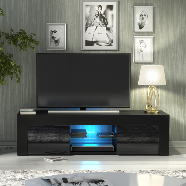 Enhance your living room with this bold and elegant 130 cm black TV unit, featuring a striking combination of a black matt body and black high gloss doors. Designed for lovers of contemporary aesthetics, this compact media cabinet adds sleek contrast and depth to any space. The two side compartments with doors provide discreet storage, while the central open section with a glass shelf is ideal for showcasing media players, consoles, or decorative pieces.