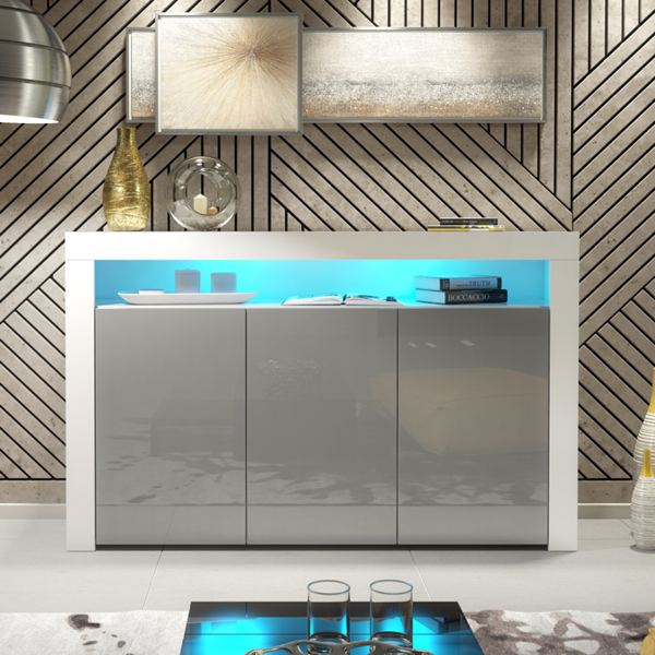 Whether placed in a dining room, hallway, or living area, this white and grey gloss sideboard offers the perfect blend of stylish design, ample storage, and modern LED lighting.