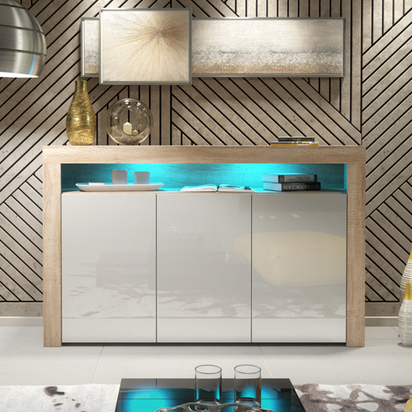 This stylish sideboard is part of a wider matching furniture collection from Mex Furniture, including TV units, tall cabinets and display units, allowing you to build a cohesive and modern interior layout. With its blend of oak texture, gloss finishes, push-to-open doors and LED lighting, this unit offers both functionality and standout design.