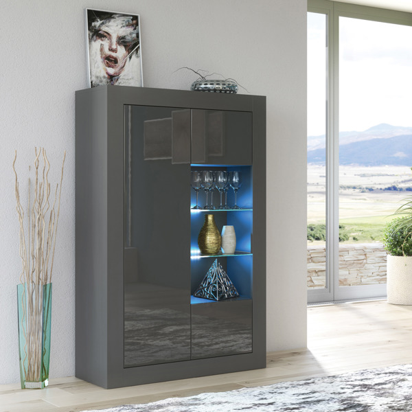 This cabinet is part of a coordinated Mex Furniture collection, including TV units, sideboards and tall cabinets. With its all-grey matt and gloss combination, glass shelving and LED lighting, this piece blends elegance, functionality and everyday convenience – a smart choice for any home.