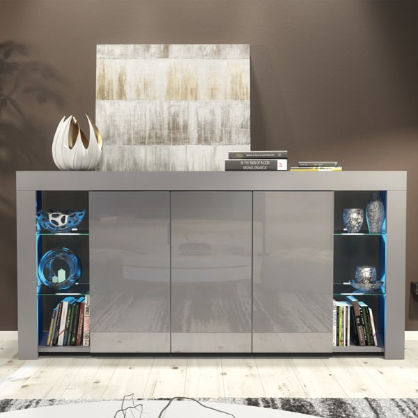 Bring elegance and practicality into your living room with this contemporary grey sideboard, designed to be both a visual centerpiece and a smart storage solution. With its stylish matt body and high gloss grey doors, this unit adds depth and texture to your interior while staying neutral and refined. Open glass shelving on each side lets you display décor, books, or collectables — perfectly highlighted with the included free LED lighting, creating a stunning ambiance in any modern space.