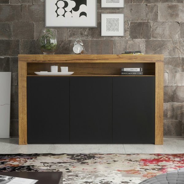 Add bold contrast and practical storage to your home with this 155 cm oak and black sideboard, crafted to combine warm natural tones with modern dark accents. The oak matt body provides an inviting base, while the black matt doors add a sharp and contemporary edge – ideal for industrial, loft or Scandinavian interiors.
