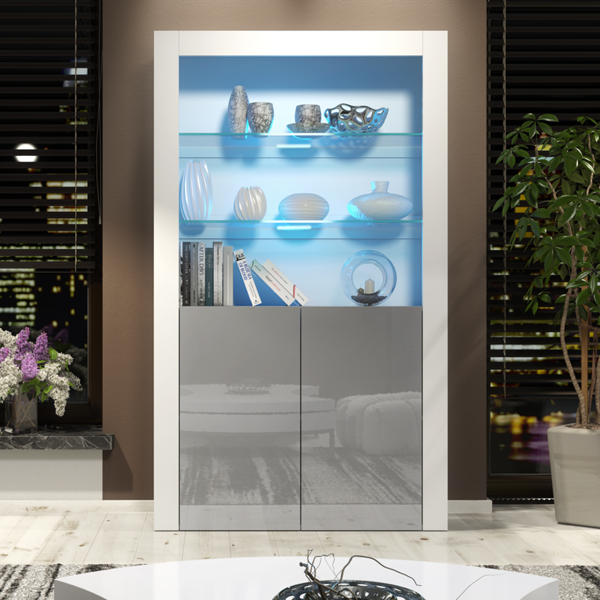 Bring a touch of modern sophistication to your interior with this tall display cabinet featuring a white matt body and grey high gloss doors. The fresh contrast between white and grey tones gives this piece a clean and elegant presence, ideal for brightening up any contemporary space. The upper section includes two tempered glass shelves, perfect for showcasing decorative items, books, or glassware, while the free LED lighting adds a subtle glow that enhances the overall design and atmosphere. The two gloss doors in the lower part provide ample hidden storage, keeping your room neat and stylish.
