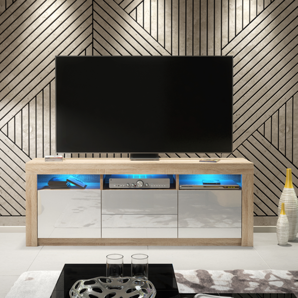 Add warmth and contemporary charm to your living space with this 160 cm TV unit, designed with a stunning oak matt body and sleek white high gloss drawer and door fronts. The natural oak texture brings a soft, earthy tone to your home, while the glossy white surfaces add a touch of modern sophistication and light reflection.